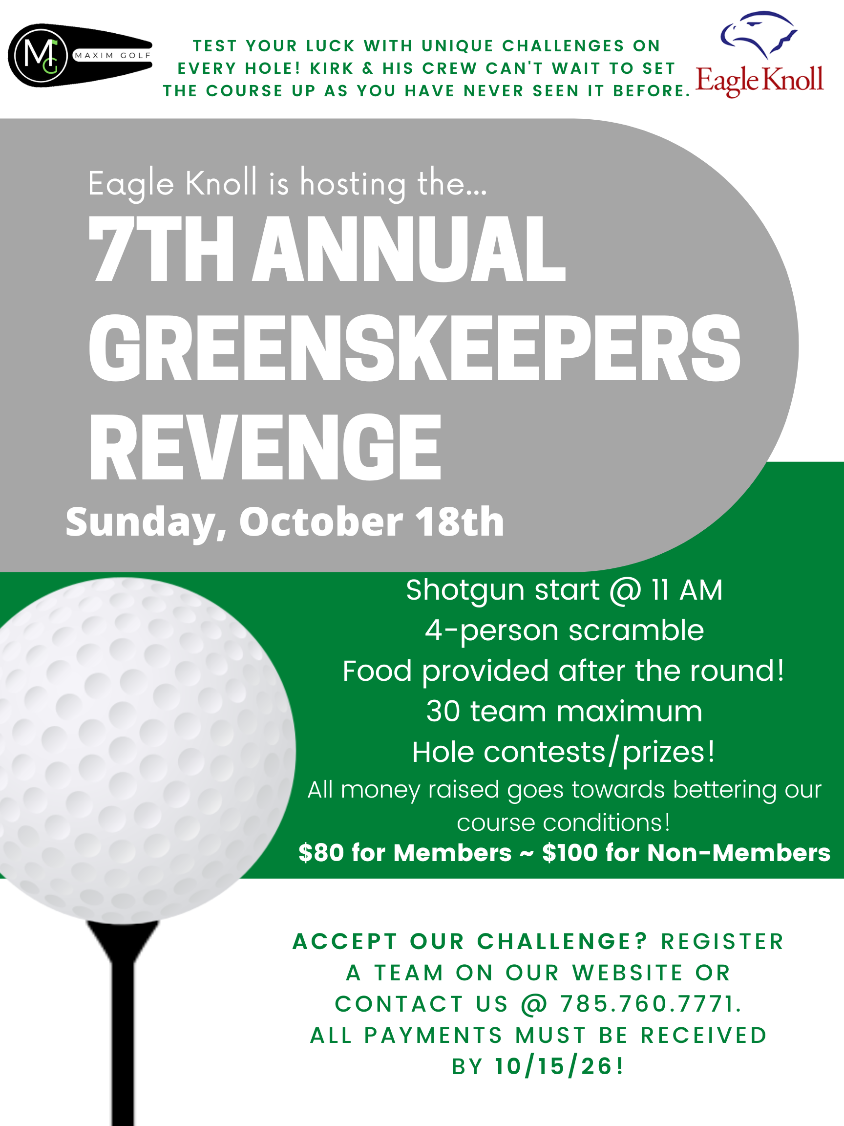 Come join us at our 7th Annual Greenskeepers Revenge. It is a 4-person scramble with food provided after the round. There are 30 teams maximum with hole contests/prizes. All money